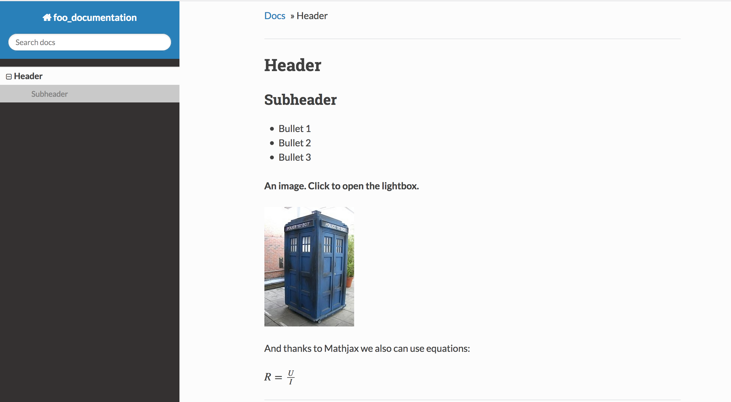 enable_dollar_delimiter option to allow dollar delimiters.To make lightbox work properly we need to include lightbox.min.js and lightbox.min.css in the documentation build. We do this with the extra_css and extra_js statements in the mkdocs.yml file. Of course we also need to add the files to our directory. Download Lightbox2 from here and copy lightbox.min.js to /docs/js/lightbox.min.js and lightbox.min.css to /docs/css/lightbox.min.css.